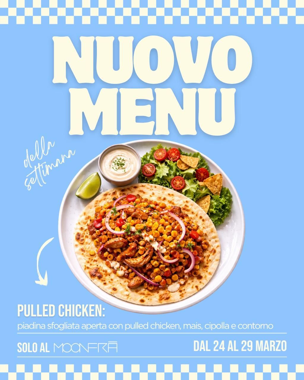 🌮 PULLED CHICKEN: piadina sfogliata aperta con pulled chicken, mais, cipolla e contorno